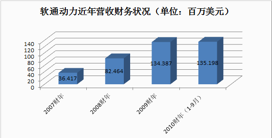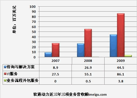 軟通動(dòng)力的收入從2007年的3642萬美元大幅增長(zhǎng)到2009年的34億美元,年復(fù)合增長(zhǎng)率為92.15%。2010財(cái)年前九個(gè)月,軟通動(dòng)力的收入達(dá)到1.35億美元,超過了2009年全年的收入。