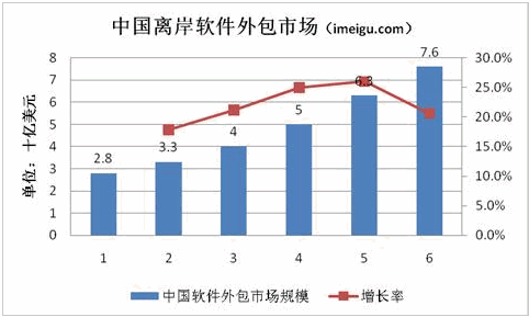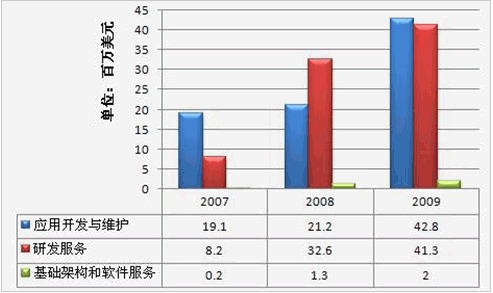 中國(guó)IT服務(wù)企業(yè)承擔(dān)的離岸IT服務(wù)項(xiàng)目主要是軟件外包。這些業(yè)務(wù)包括應(yīng)用程序開發(fā)和管理、產(chǎn)品開發(fā)、包裝解決方案服務(wù)、全球化和本地化服務(wù)等。這些客戶包括外國(guó)公司和外國(guó)公司在中國(guó)的分支機(jī)構(gòu)/子公司。中國(guó)的離岸軟件外包市場(chǎng)近年來也發(fā)展迅速。根據(jù)IDC 2010年7月的報(bào)告,中國(guó)離岸軟件市場(chǎng)規(guī)模將從2009年的28億美元增長(zhǎng)到2014年的76億美元,年復(fù)合增長(zhǎng)率為22.4%。