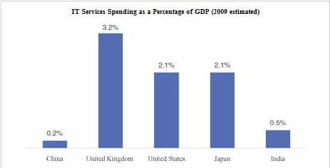 根據(jù)IMF調(diào)查公布的數(shù)據(jù),中國(guó)2009年實(shí)際GDP增長(zhǎng)率為8.5%,2010年將增長(zhǎng)9%,是世界上增長(zhǎng)最快的國(guó)家。然而,中國(guó)在 IT 服務(wù)上的支出仍然相對(duì)較低。根據(jù)調(diào)查數(shù)據(jù)和國(guó)際貨幣基金組織公布的數(shù)據(jù),2009年中國(guó)IT服務(wù)支出GDP僅為0.2%,而英國(guó)為3.2%,美國(guó)為< @2.1% 在同一時(shí)期。, 2.1% 代表日本,0.5% 代表印度。也可以看出,中國(guó)IT服務(wù)市場(chǎng)還有很大的增長(zhǎng)空間。