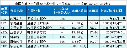 目前,軟通動(dòng)力等多家中國(guó)信息技術(shù)公司已在美國(guó)上市。以下是各大公司的主營(yíng)業(yè)務(wù)、上市時(shí)間及市值、市盈率等。