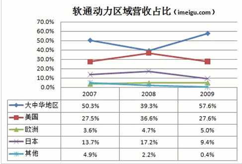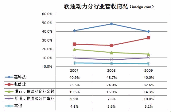 這些行業(yè)中,高科技行業(yè)占比最大,主要來自微軟、IBM等大型企業(yè)集團(tuán)的軟件分包項(xiàng)目;這些客戶也是軟通動(dòng)力最賺錢的客戶。2007年、2008年和2009年,來自高新技術(shù)產(chǎn)業(yè)的收入占軟通動(dòng)力總收入的40%以上。