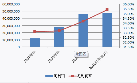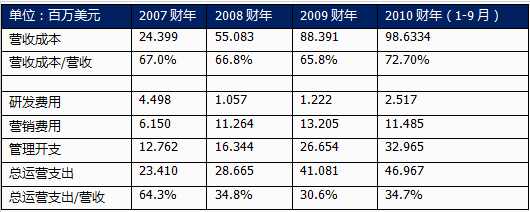 2007年以來,軟通動(dòng)力的毛利潤(rùn)逐年增長(zhǎng),從2007年的1029萬美元增加到2009年的4600萬美元;2010年前三季度利潤(rùn)達(dá)到4786萬美元;其毛利率也從2007年的28.2%提高到2009年的34.2%。