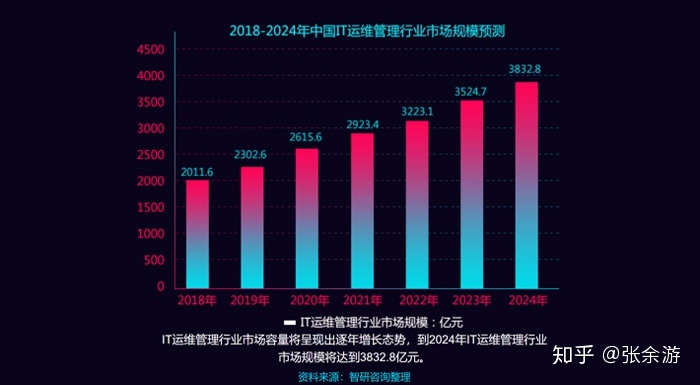 以上是我們列出的IT運維人員的能力要求或工作內容。再來看看2020年IT運維市場規模。2020年,越來越多的企業開始擁抱互聯網,利用互聯網開展“無接觸”。業務方面,尤其是在2020年初“新冠”疫情的影響下,公司為了生存,全天開通了全員網上辦公、業務網上辦理,也為企業開啟了線上業務常態化;借助互聯網,根據權威機構的公告:“這一切將產生約100萬個相關技術開發職位和約100個it運維技術,000 IT運維崗位。到2024年,IT運維行業市場容量將呈現逐年上升趨勢。到2024年IT運維管理行業年市場規模達到3832.8億元。附:IT運維學習路線圖,感興趣的朋友可以關注,自學。