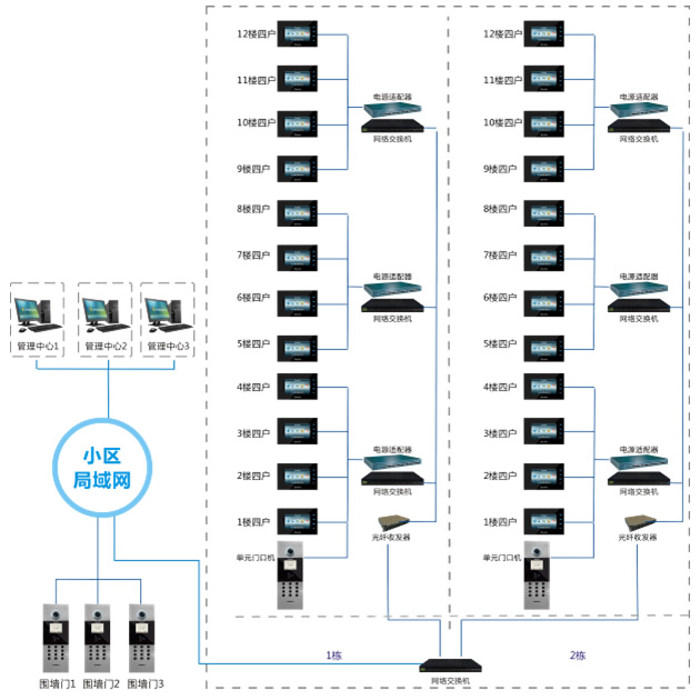 在小區、單位門口設置門口機,在物業門口設置門口機 中央設置管理軟件允許每戶設置一臺室內機,可以實現以下功能: