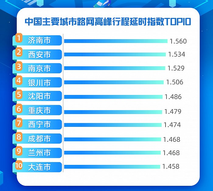 高德交通大數據監測的50個城市中,2020年一季度中國擁堵延誤指數最高的十個城市分別是:濟南、西安、南京、銀川、沉陽、重慶、西寧、成都、蘭州、大連。其中,濟南路網高峰出行延誤指數為1.56,平均時速僅為31.79km/h。